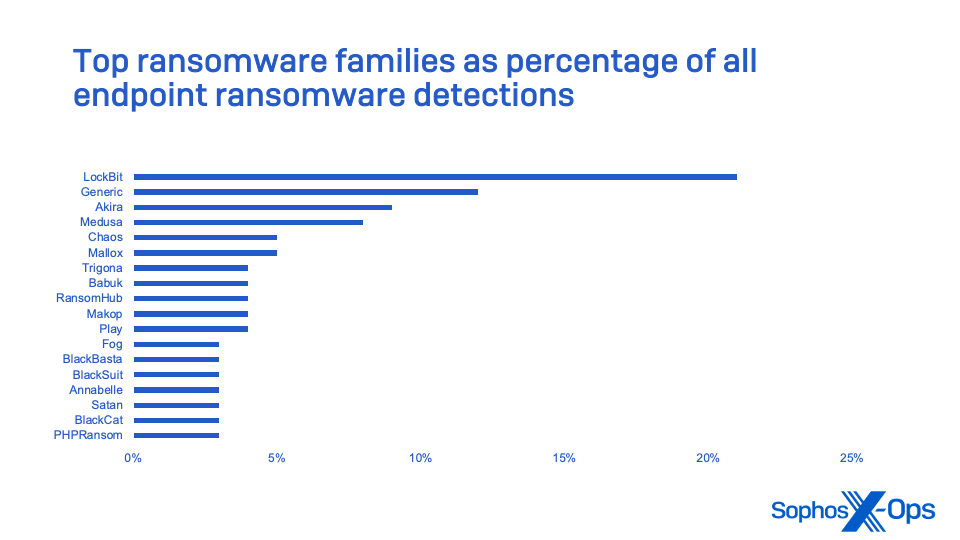 実際のインシデントでは、2024 年には RaaS (サービスとしてのランサムウェア) の Akira が最多となり、最終的には LockBit が残した空白を埋める形となりました。2022 年に初めて確認された Akira による攻撃は、2023 年後半に急増しました。このグループとアフィリエイトは、2024 年を通して着実に活動を続け、8 月には Akira による検出がソフォスのお客様から報告されたランサムウェア検出件数の 17% を占めました。第 1、第 2 四半期と比べて、検出割合が 2 倍に増加したことを意味します。年末時点でも、Akira の検出件数は依然としてランサムウェア検出報告の 9% を占めていました。