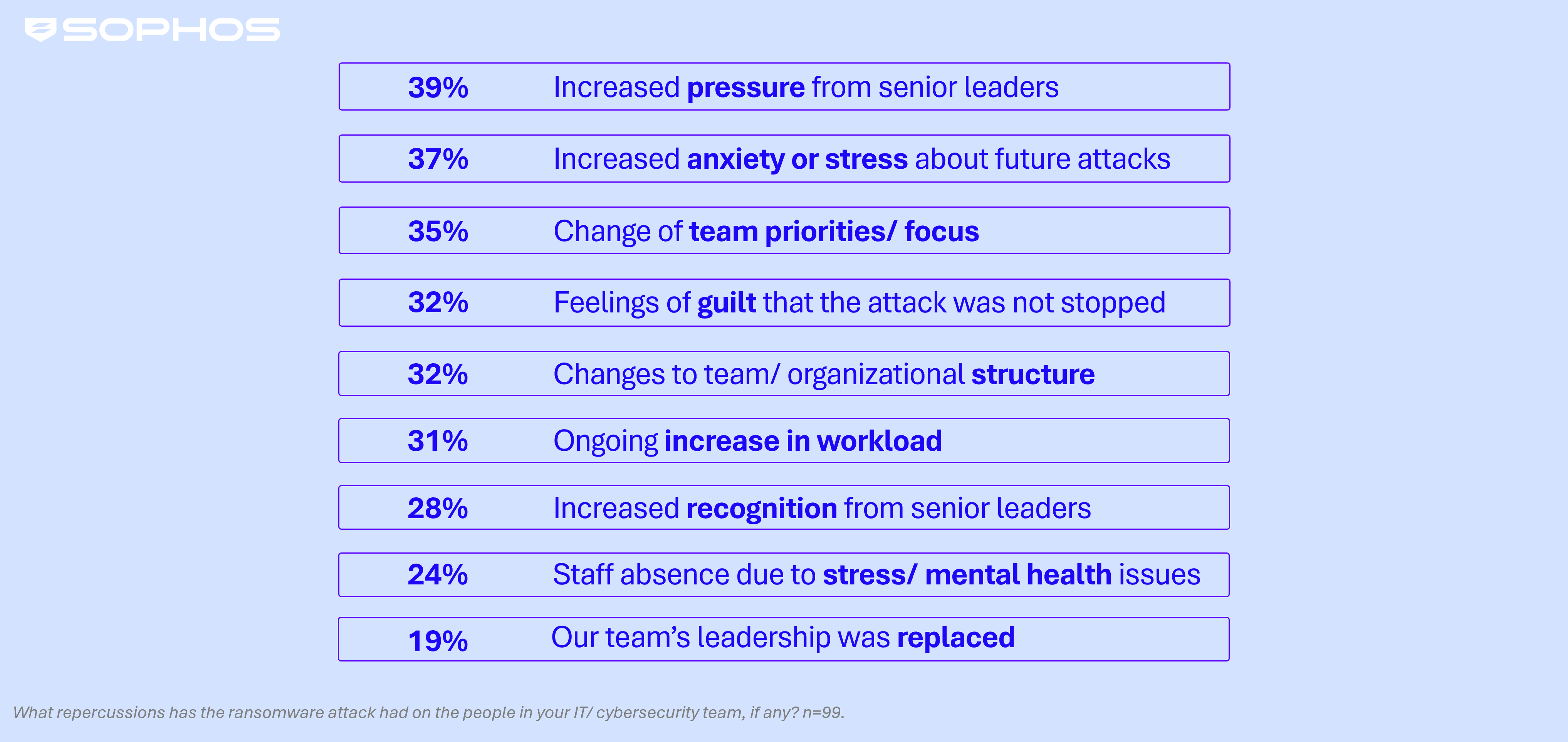 調査結果は、ランサムウェア攻撃でデータが暗号化された場合、医療機関の IT/サイバーセキュリティチームに深刻な影響があることを示しており、回答者の 39% がその一部として経営層からの圧力の増加を挙げています。その他の影響としては、以下が含まれます (ただし、これらに限定されるものではありません)。