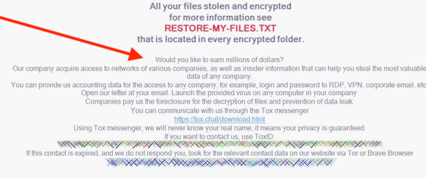 また、最近のランサムウェアのオペレーターは、内部の人間を募ってランサムウェア攻撃を手助けさせ、その見返りとして収益の一部を譲渡するという変わった手法を用いています。広く報道されている例では、LockBit 2.0 (リンク先: 英語) のオペレーターが、多額の報酬と引き替えに、「あらゆる企業」のネットワークへの侵入と暗号化に協力するよう、内部関係者を募集する広告を掲載していました。LockBit 2.0 によってファイルが暗号化された後に被害者のコンピューターに表示される以下のような通知は、攻撃者が、第三者である被害者の関係会社やサプライヤーへの侵入を手助けする内部の協力者を募集しようとしていることを示しています。この事実は、被害者だけでなく、関係会社にとっても特に大きな懸念材料です。