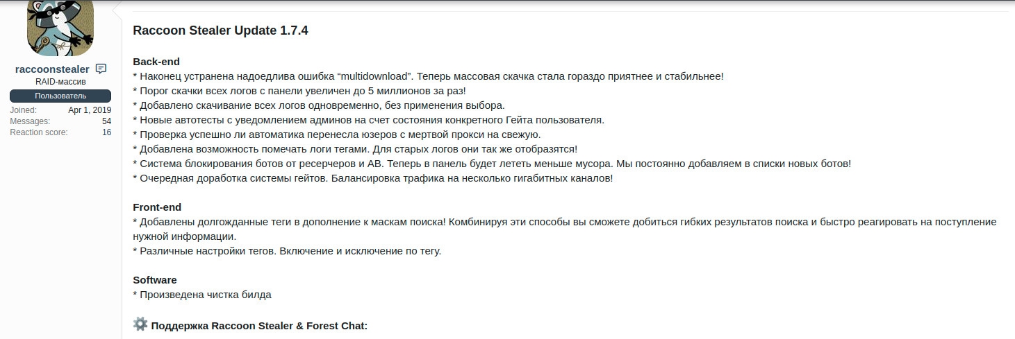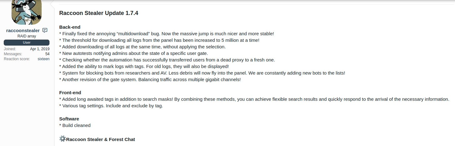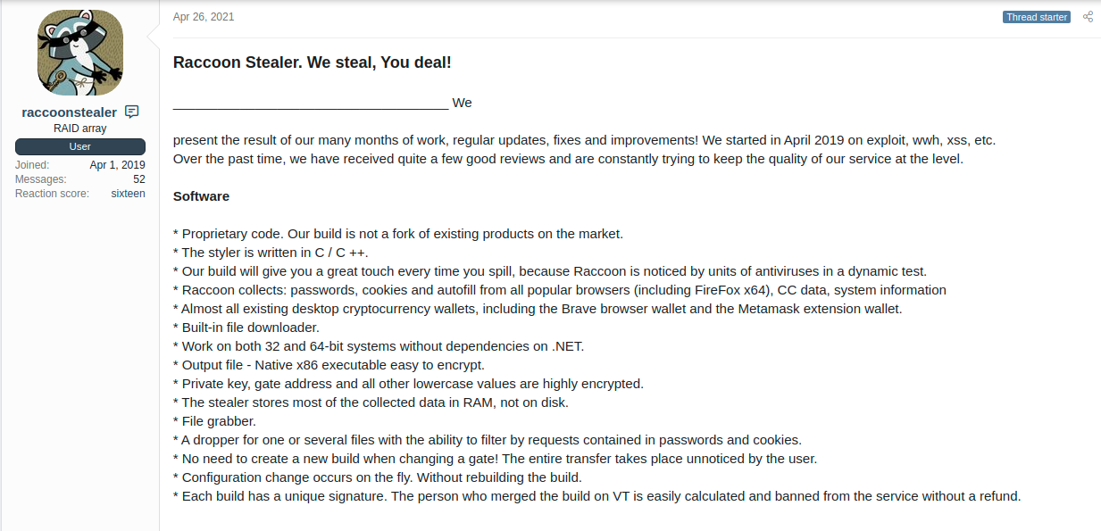 多くの情報窃取マルウェアと同様に、Raccoon Stealer は単体のマルウェアとしてではなく、サービスとして販売されています。Raccoon の開発者は、ダークウェブのマルウェア関連フォーラムで、少なくとも過去 2 年間にわたり、「サービスとしての情報窃取マルウェア」プラットフォームを売り込んできました。Raccoon は、Tor ベースの C2「パネル」サーバーから制御されており、新機能やバグフィックスを定期配信するなど、他の Web ベースの商用サービスと同様に継続的な開発が行われています。また、感染したマシンに展開済みのマルウェアに対しても、自動アップデートを提供します。主にロシア語で書かれた掲示板で販売されていますが、英語の広告を出されており、英語でのサポートも提供しています。
