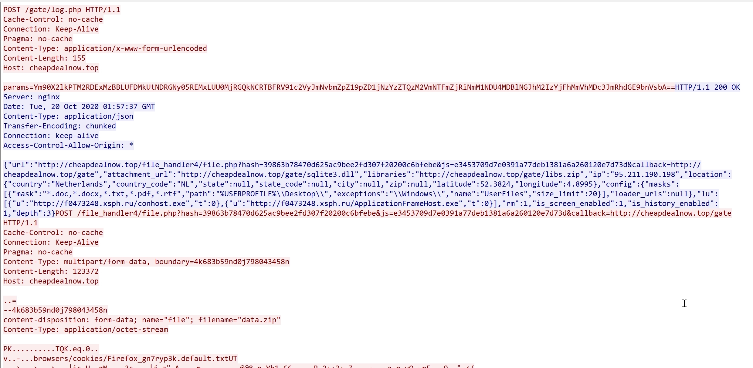 Raccoon がゲートに送信する最初の HTTP POST には、base64 エンコードされた「params」フィールドが含まれており、このフィールドには、情報窃取ボットの一意の識別子 (bot_id) と、先に復号化された構成 ID が格納されています。C2 ゲートは、情報窃取ボットの構成情報を含む JSON オブジェクトで応答します。