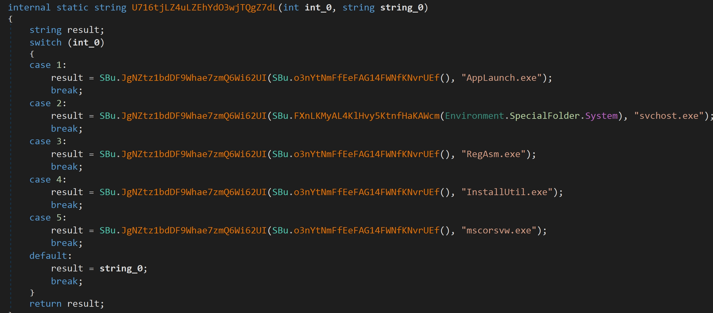クリッパーマルウェアをメモリにロードするために使用される RunPE モジュールは、5 つの実行ファイルの中から選択して実行し、マルウェアコードに置き換えることができます。ローダーの暗号化されたペイロードは、QuilClipper 本体です。