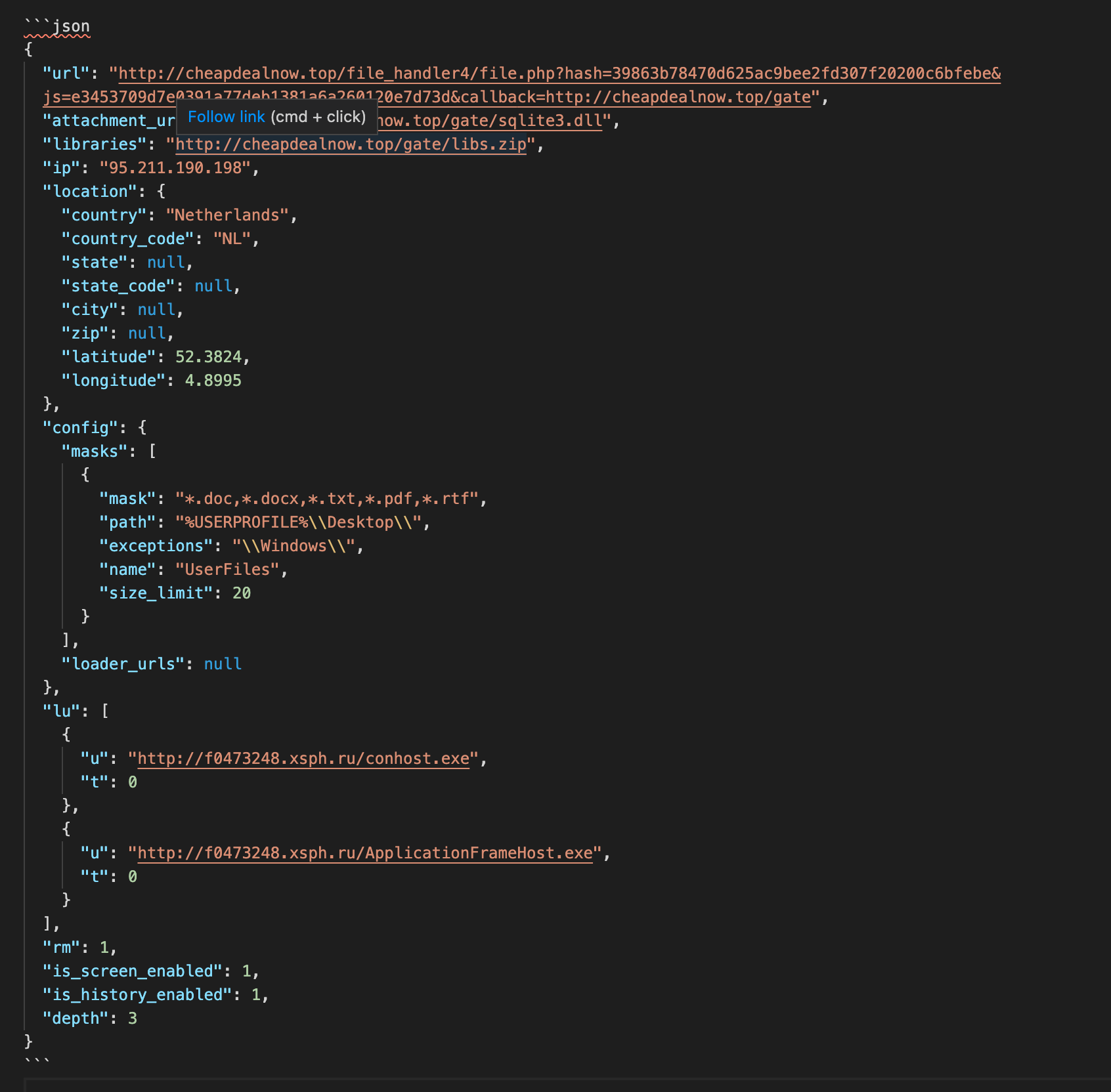 この構成には、Raccoon Stealer の必要なライブラリファイルを取得するためのリンクが (場合によっては、追加のペイロードのリンクも) 含まれています。ソフォスが分析したサンプルでは、セカンダリペイロードはクリプトマイナーでした。