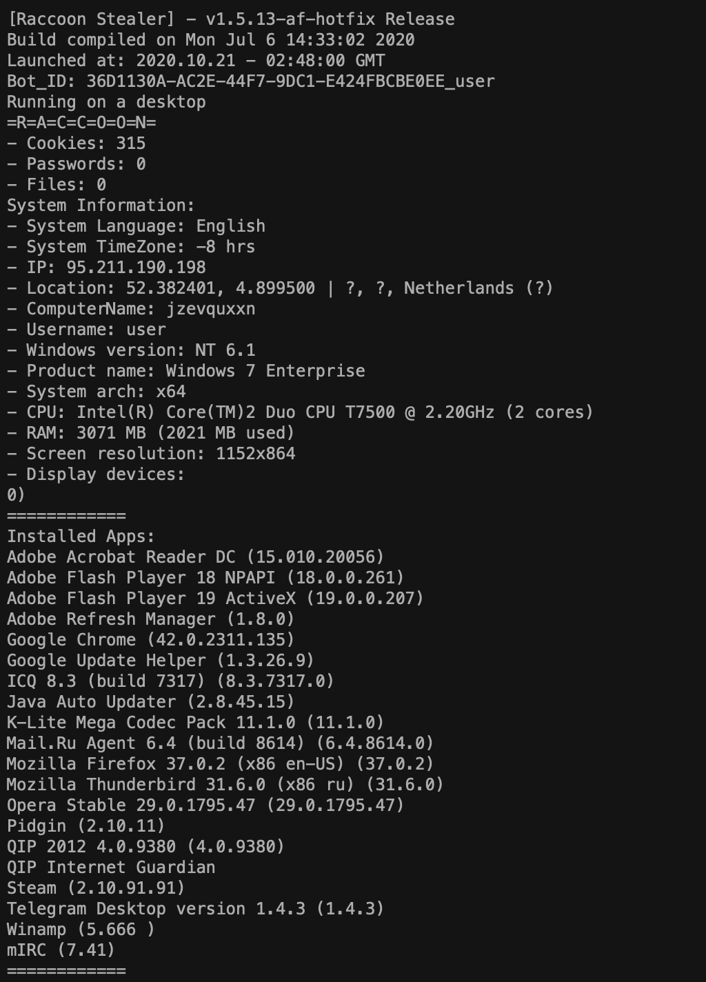 マシンからデータを収集した Raccoon は、データをまとめてアーカイブし、C2 にアップロードします。アーカイブには、被害者のデスクトップのスクリーンショット (screen.jpg)、収集したシステム情報 (System Info.txt)、ブラウザ/電子メールクライアント/暗号通貨ウォレットなどから盗んだデータが保存されます。