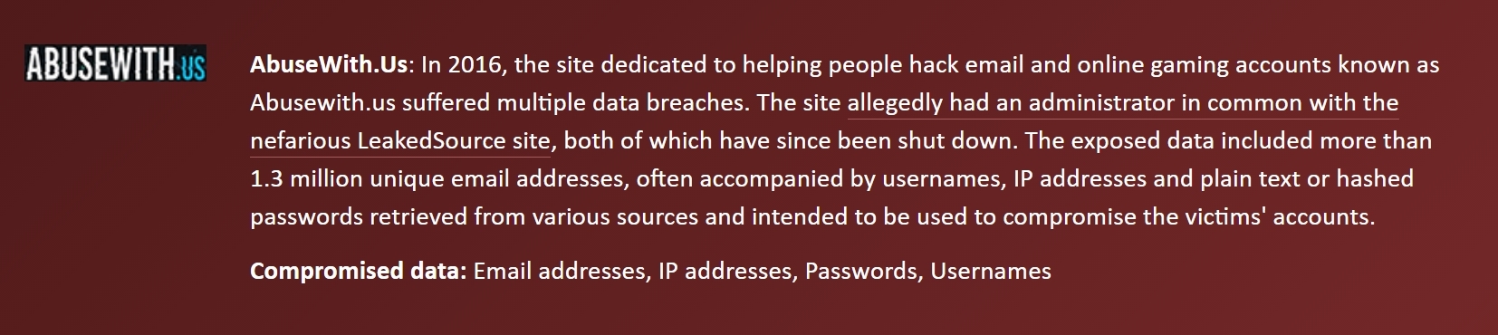 Have I Been Pwned によると、このアドレスは、ある「ハッキング」コミュニティ (下記参照) や、LinkedIn、Dropbox、Bitly などの正規サイトの登録に使用されていました。