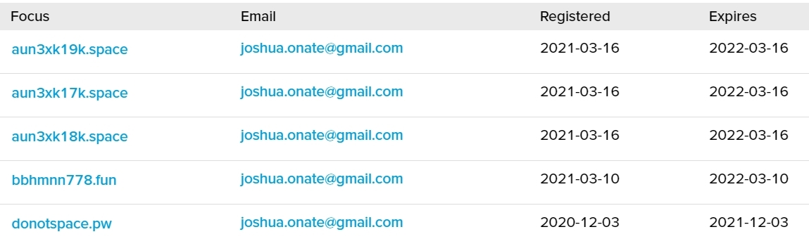 ペイロードのダウンロードを行う第 2 段階のドメインの多くは、登録に使用された 1 件の Gmail アドレスと関係があります。たとえば、Youtube で公開されている Raccoon は、aun3xk17k.space を使って QuilClipper をダウンロードしています。