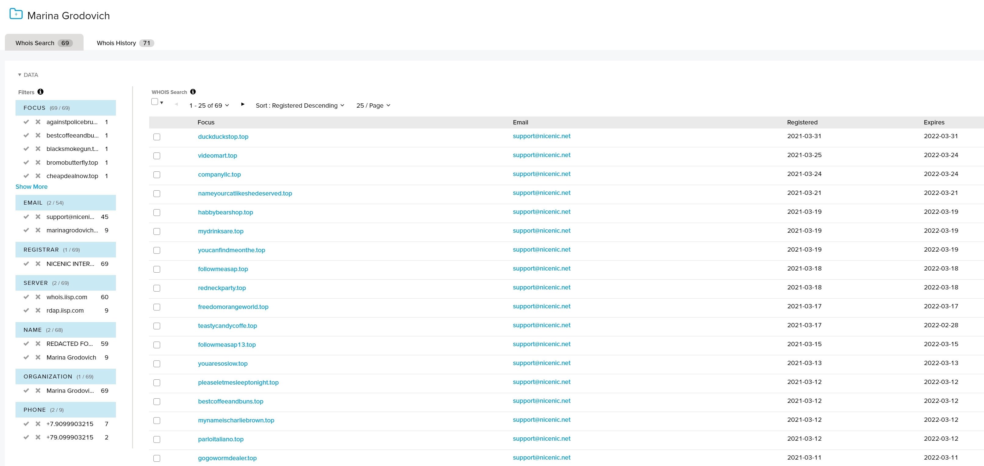 さらに、過去 6 か月間に Raccoon のインフラストラクチャと関連があった他のドメインを調べてみました。Raccoon Stealer の「ゲート」ドメインの登録には、Marina Grodovich という名前が頻繁に登場します。この名前は、2020 年 9 月以降、 Raccoon Stealer 攻撃で使用された計 94 個のドメインに関連しています。