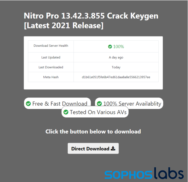 これらのサイトは、「クラッキングされた」正規のソフトウェアパッケージのレポジトリであると宣伝していましたが、配信されたファイルは実際には偽装されたドロッパーでした。ダウンロード用のリンクをクリックすると、Amazon Web Services にホストされている一連のリダイレクタ JavaScript に接続され、複数のダウンロード先のいずれかに誘導され、さまざまなバージョンのドロッパーが配信されます。