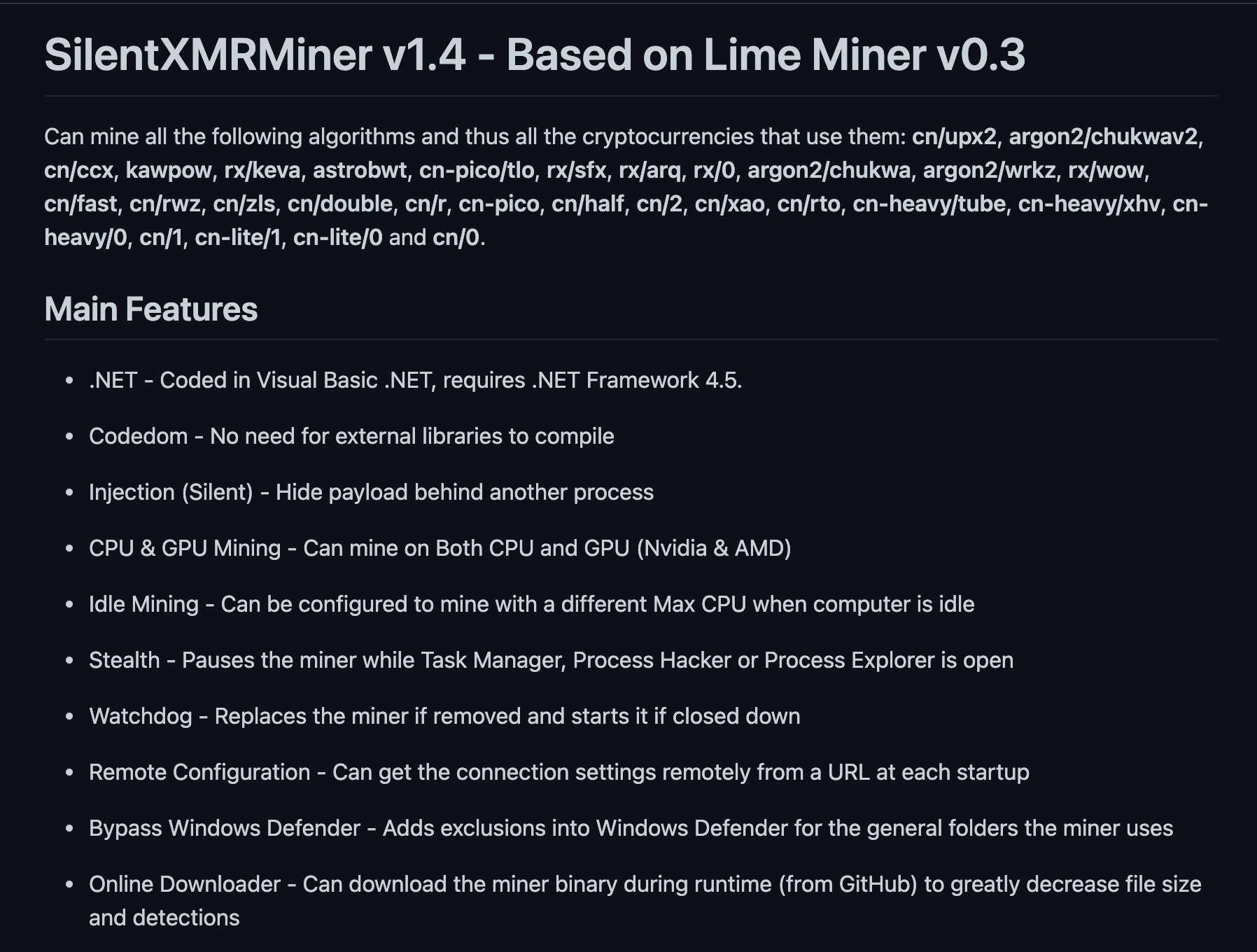 コードそのものは、Visual Basic .NET で記述された SilentXMRMiner をベースにしています。