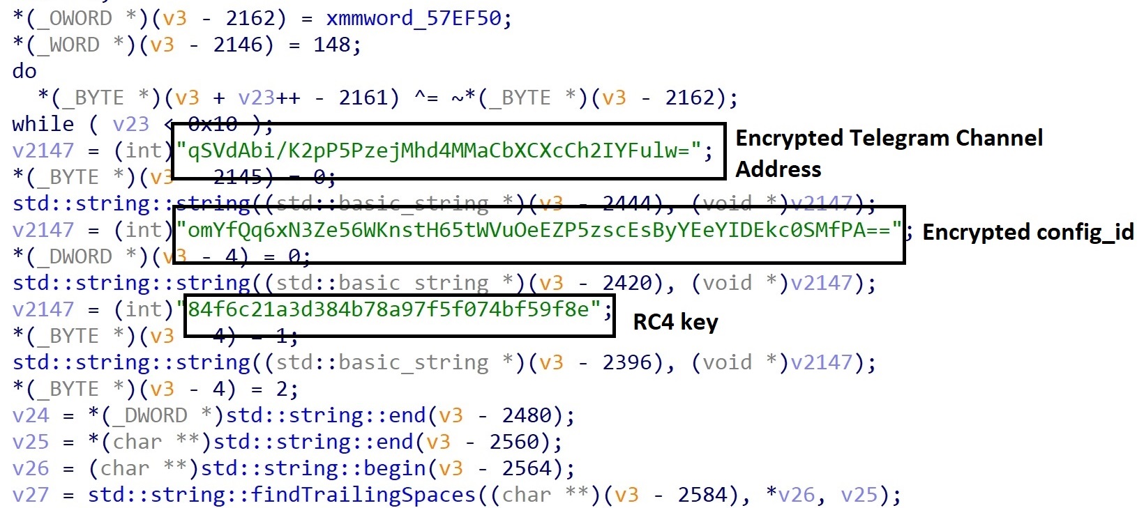 Raccoon は、ハードコードされた RC4 鍵を使用して、チャンネル説明のメッセージを復号化します (このメッセージには、C2 の「ゲート」のアドレスが含まれます)。ただし、これは単純な復号化プロセスではありません。生成された文字列の一部は、チャネル説明の先頭と末尾から切り取られ、続いてコードがそのテキストを RC4 で復号化し、C2 ゲートアドレスを取得します。