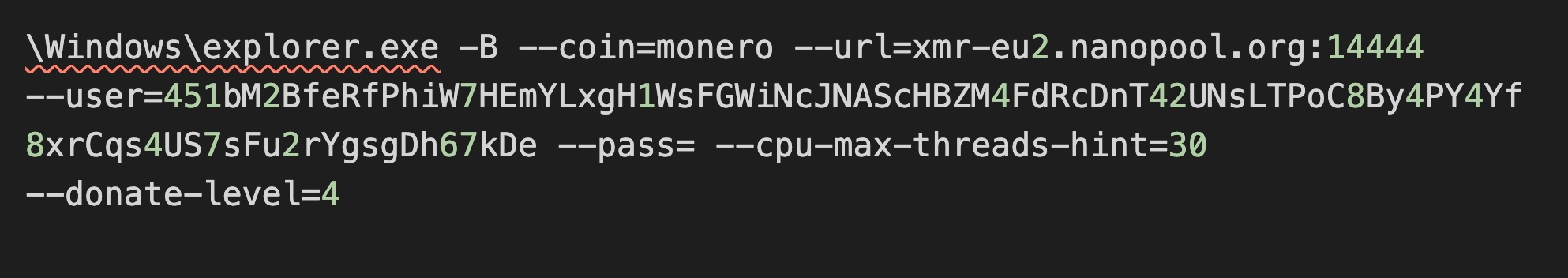 プロセスハロウイングによって「空洞化」したプロセスに対し、ローダーからマイナーの構成がパラメータとして渡されます (上記のプロセスフローチャートの左上にある「explorer.exe」プロセスを参照)。構成パラメータには、マイニングするコインの種類や、接続先となるマイニングプールの URL など、マイナービルダーが設定した内容が含まれています。