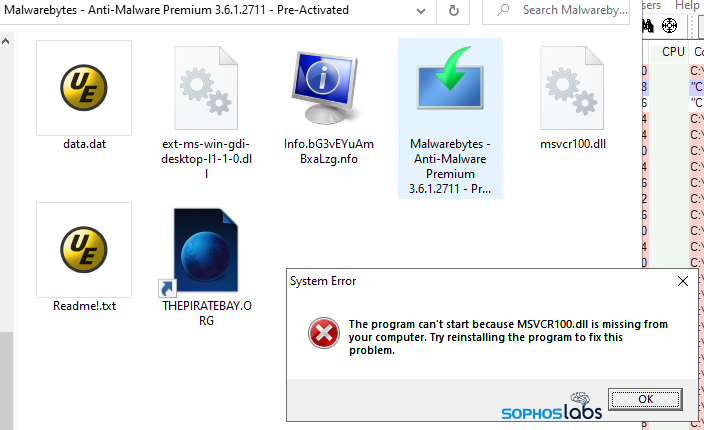 エンドユーザーがこのマルウェアを実行しても、あまり影響を受けているようには感じないかもしれません。ダブルクリックすると、「MSVCR100.dllがコンピュータに存在しないため、プログラムを開始できません。この問題を解決するには、プログラムを再インストールしてください」という内容の偽のエラーメッセージが表示されます。