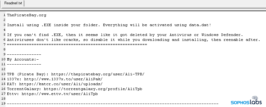 このマルウェアの少なくとも一部は、さまざまなソフトウェアパッケージの海賊版を装い、ゲームチャットサービスである Discord でホストされていました。また、Bittorrent で配布された他のコピーには、人気のあるゲームや生産性向上ツール、さらにはセキュリティ製品の名前が付けられており、The Pirate Bay の有名なファイル共有アカウントから発信されたと思われる追加ファイル (これらについては本文の後半で詳しく説明します) が添付されていました。