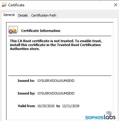 マルウェアの実行ファイルの多くは、すべてではないにせよ、偽のコード署名者によってデジタル署名されていました。これにより、暗号の有効性に関わらず、ファイルが署名されているかどうかの初歩的なチェックは通過することができるかもしれませんが、これらの署名付きファイルは精査には耐えません。署名には、たった 18 文字の大文字のランダムな文字列である署名者の名前が付けられています。証明書の有効期限は、ほとんどのファイルがダウンロード可能になった最初の日かその前後に開始され、2039 年 12 月 31 日に失効するように設定されています。