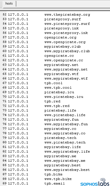 このマルウェアの出所を特定することはできませんでしたが、その動機は明確であると思われます。つまり、ソフトウェアの海賊版サイトへのアクセスを ( 一時的にせよ ) 阻止し、ユーザーが使用しようとしていた海賊版ソフトウェアの名前を Web サイトに送信し、さらに二次的なペイロードを配信するのです。このファイルは、数百から 1000 以上の Web ドメインを HOSTS ファイルに追加しており、ローカルホストのアドレスである 127.0.0.1 を指すようにします。