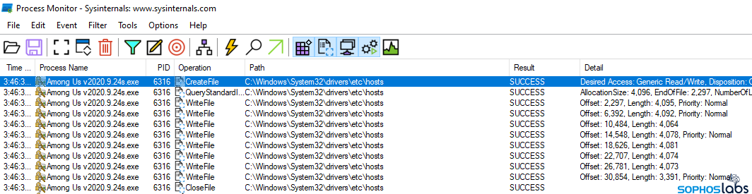 最後に、HOSTS ファイルの変更を行います。最近の Windows コンピュータでは、マルウェアは権限を昇格して、管理者権限のあるユーザーでなければ、実行できなくなっています。ほとんどのマルウェアは、Windows で権限を昇格するようにトリガーしましたが、すべてのマルウェアが昇格するわけではありません。自動的に権限の昇格を要求しなかった検体は、通常の実行では HOSTS ファイルの変更に失敗しましたが、管理者として実行してみると、変更に成功しました。