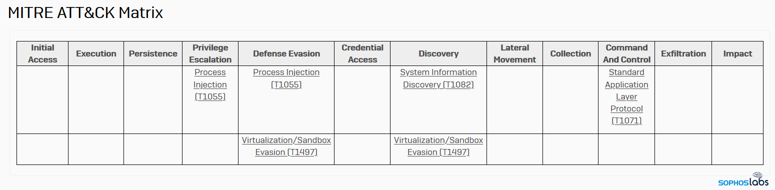 ソフォスのエンドポイント製品は、独自のランタイムパッカーを検知してこの脅威を識別します。このランタイムパッカーは、別の無関係なマルウェアファミリーである Qbot が Mal/EncPk-APVとして使用しているものと同じです。