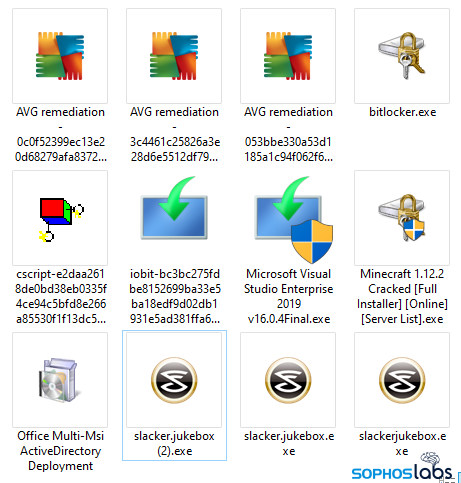 同様に、マルウェアの実行ファイルのプロパティシートは、マルウェアのファイル名が示すものとは一致しません。ほとんどのファイルは、ゲームや生産性向上ソフトウェアのフル機能のライセンスコピーのインストーラーであると表示されていましたが、実際のファイルの多くは、”AVG remediation exe”、”BitLocker Drive Encryption”、”Microsoft Office Multi-Msi ActiveDirectory Deployment Tool” など、「ファイルの説明」欄にはまったく異なる名前が表示されていました。