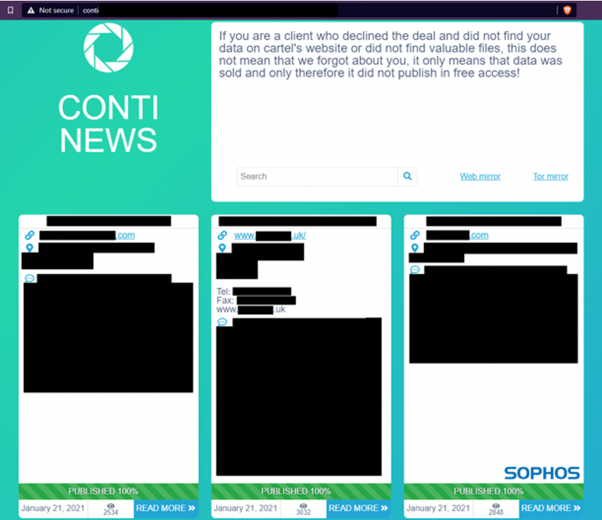 Conti は、2020 年 5 月に初めて確認されたランサムウェアです。他のランサムウェアファミリと類似点がいくつかありますが、関連性はないと現時点ではソフォスは考えています。発見されて以降、Conti は急速に進化しており、標的システム全体で暗号化とデプロイメントを実行するスピードが速いことで知られています。Conti は暗号化するだけでなく、盗み出した情報を公開すると脅す、人間主導型の「二重脅迫ランサムウェア」です。Conti News サイトでは、これまでに少なくとも 180 人の被害者から盗んだデータが公開されています。