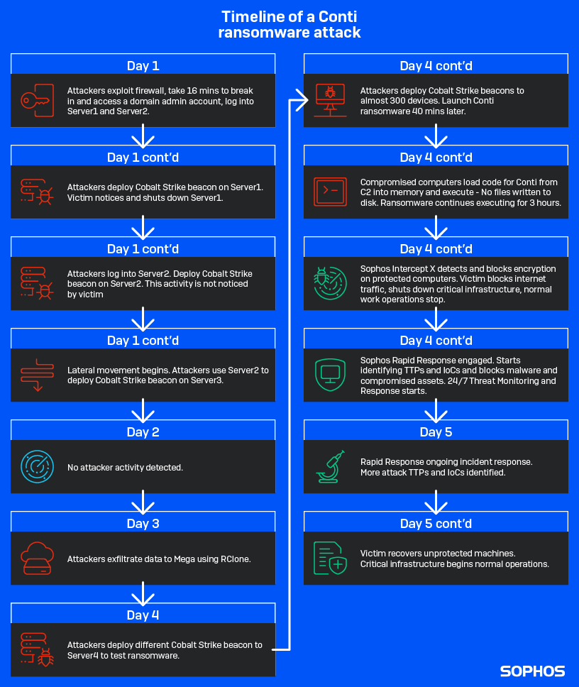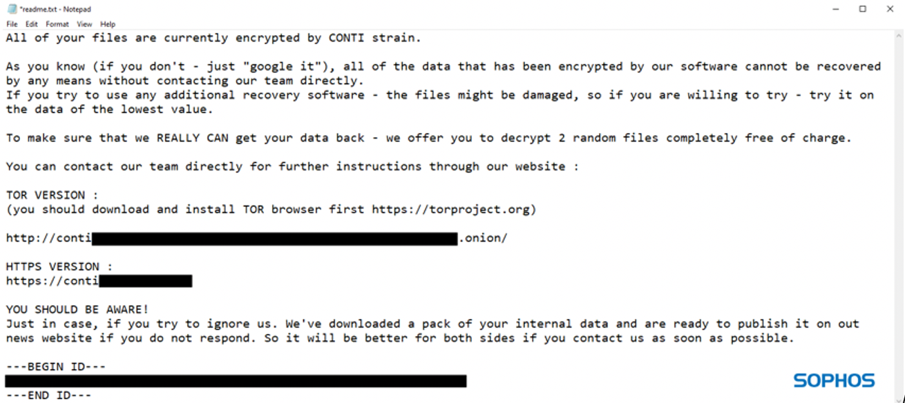 Sophos Rapid Response によると、ネットワークに侵入した Conti ランサムウェアの影響として、以下のことが考えられます。