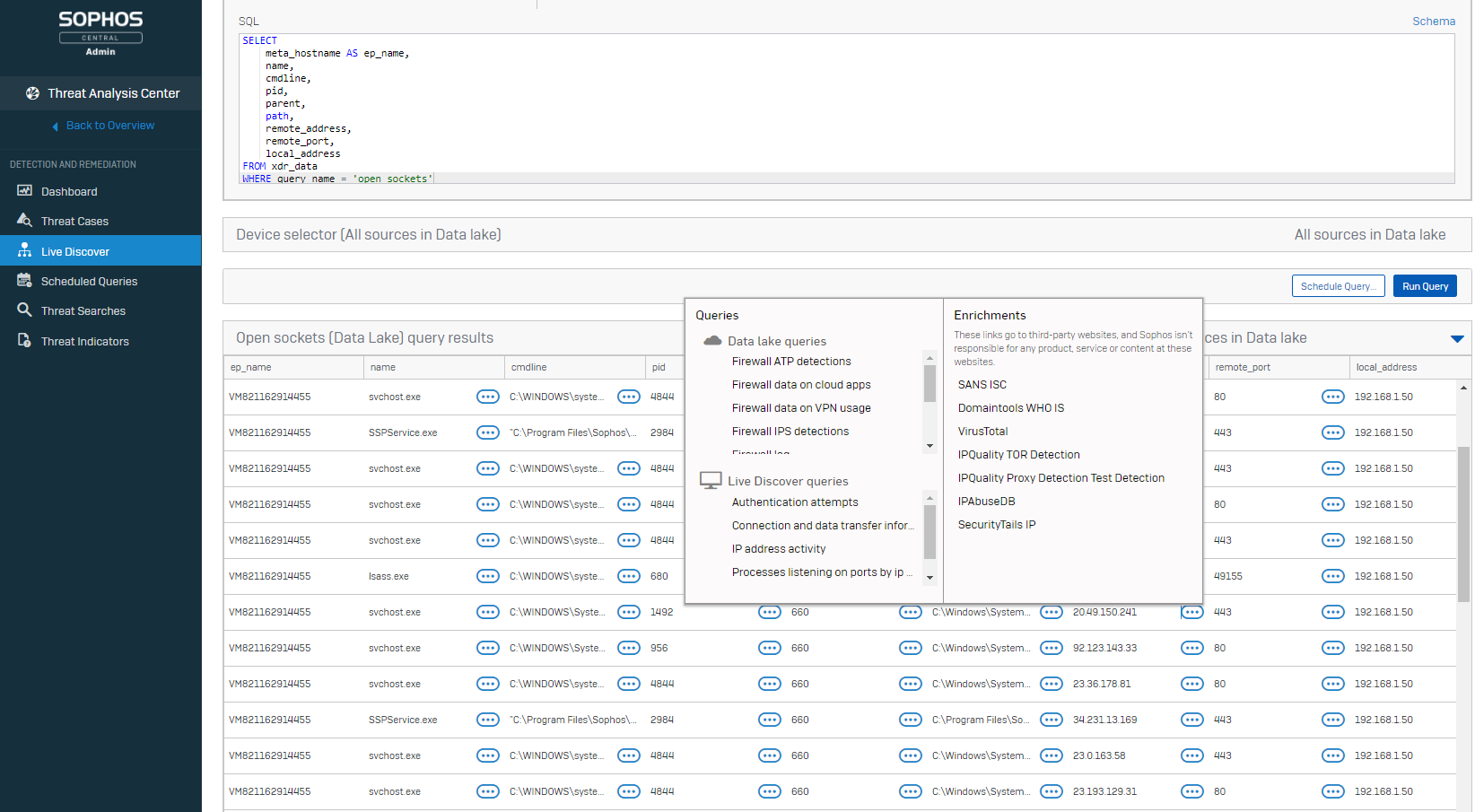 そして、攻撃を受けている恐れがある領域を特定したら、Live Discover でデバイスにクエリを送信して、豊富なライブデータを取得し、Live Response を使用してデバイスにリモートからアクセスして適切な対策を講ずることができます。