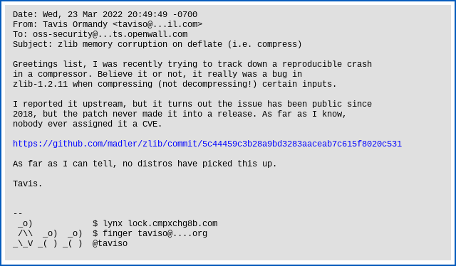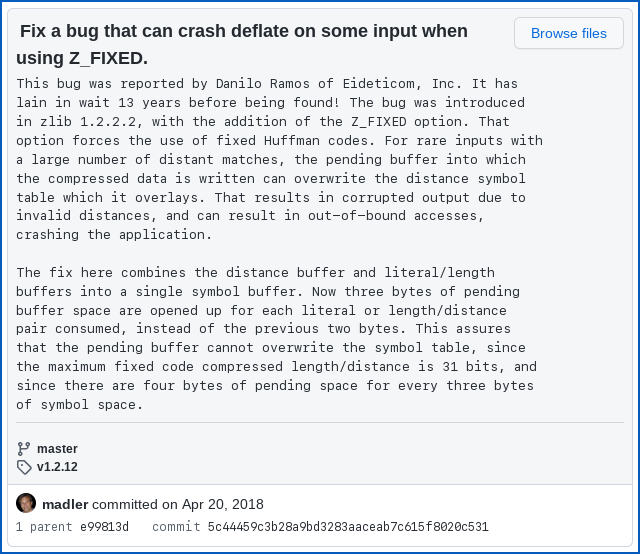 With a legacy that long, and with an algorithm that was locked down as an internet standard back in 1996, you’d no doubt assume that Zlib had very few bugs left, and that any serious ones, such as those leading to the sort of memory corruption that could be exploitable for remote code execution (RCE), would have been found by now.