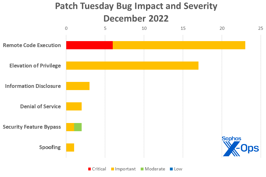 Figure 3: Even with December’s higher percentage of remote code execution vulnerabilities, 2022 was a year for elevation of privilege bugs – at least among bugs of Important or Critical severity
