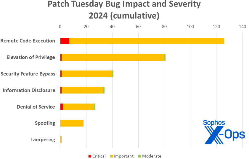 Figure 3: Security Feature Bypass leaps to third place in the cumulative patch totals for 2024, though RCE still leads the pack