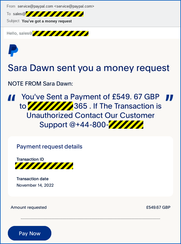 We nevertheless recommend that you report bogus requests of this sort to PayPal, which will help to get the offending account closed down and to ensure that no one else either pays up through fear or calls the given phone number “just in case”. (You can visit PayPal’s Report potential fraud page for further information, or forward suspicious emails to [email protected].)