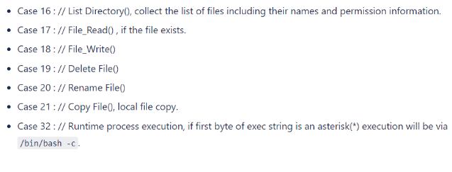 The malware has a feature that checks inbound traffic for a specific byte and executes various types of backdoor functions based on that value. The bot can be instructed to upload files to the C2 (or download file from there), modify its own configuration, execute a command on the device, or close the connection to the C2.