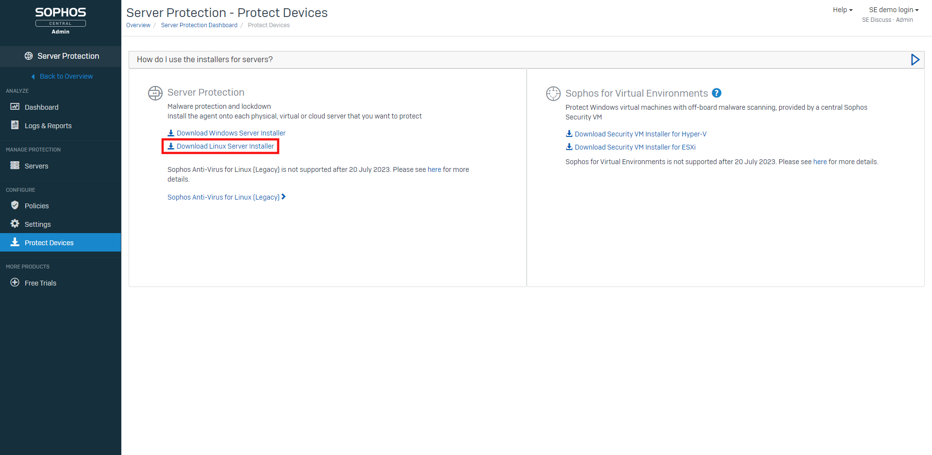 Vá para Proteção do Servidor -> Proteger Dispositivos -> Baixar Instalador do Servidor Linux. (Observe que você não precisa reinstalar o agente para se beneficiar dessa nova funcionalidade.)