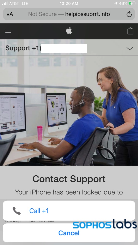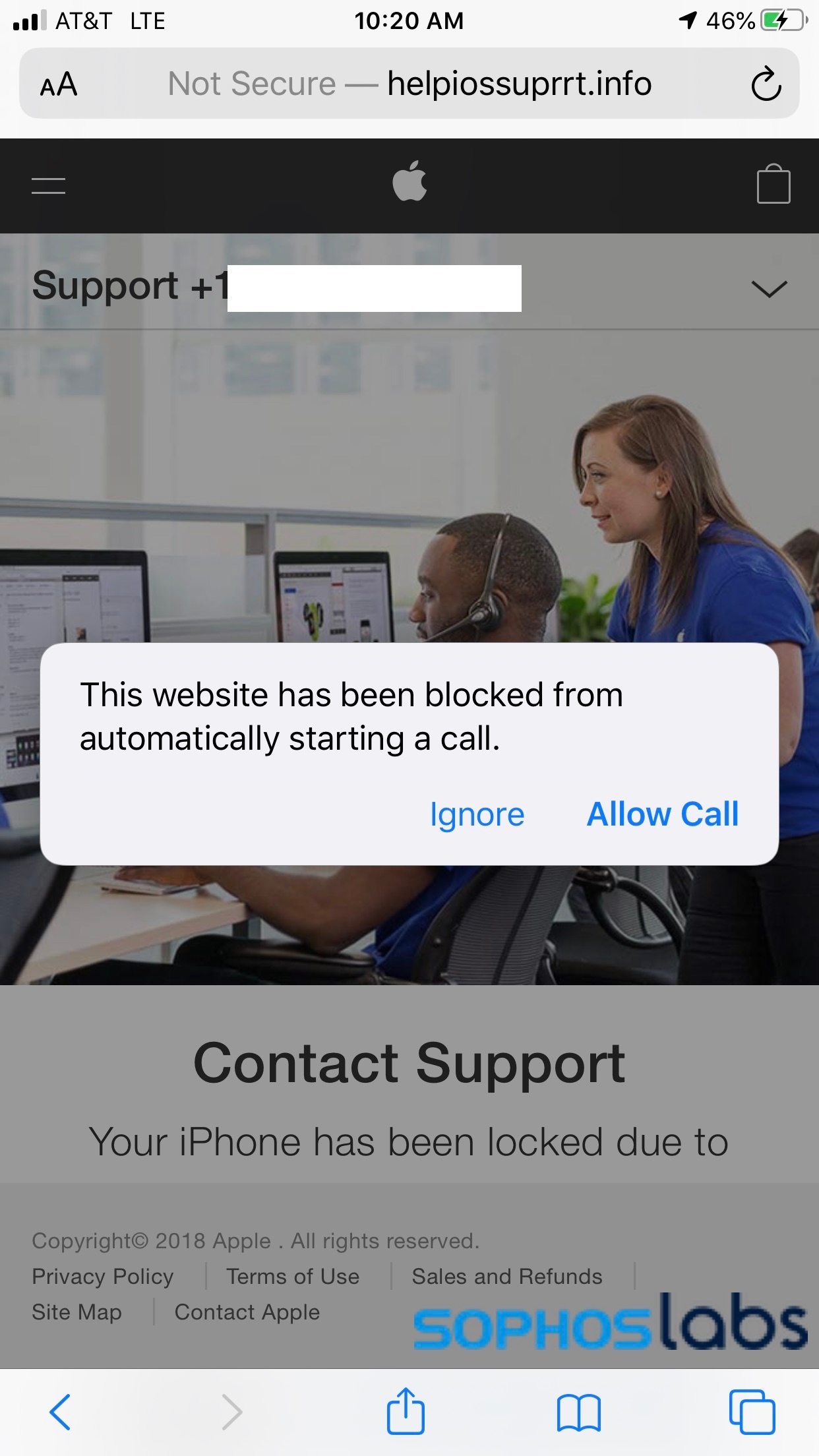 An educated user can escape from the page by opening the tab view in Safari and exiting the page. But less sophisticated users may panic and allow the call to be connected, leading to a social engineering effort by the scammers to gain their Apple ID and other personal data.