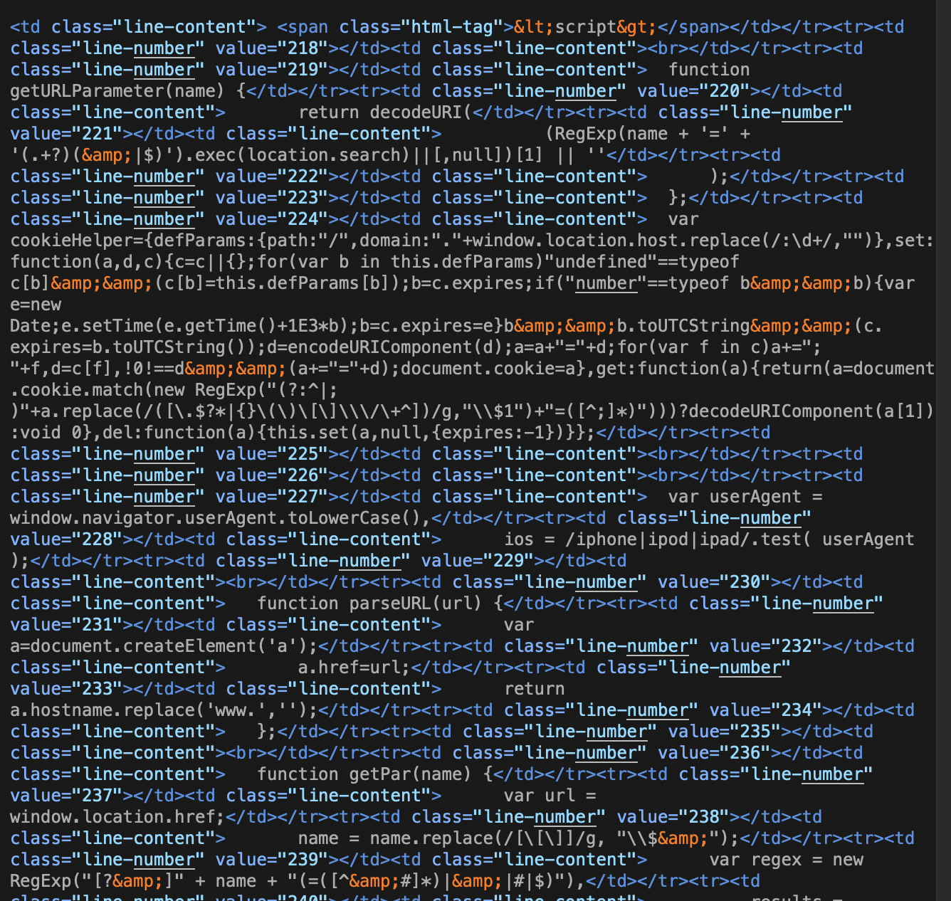 A portion of the obfuscated JavaScript within the HTML of the Apple tech support scam page.