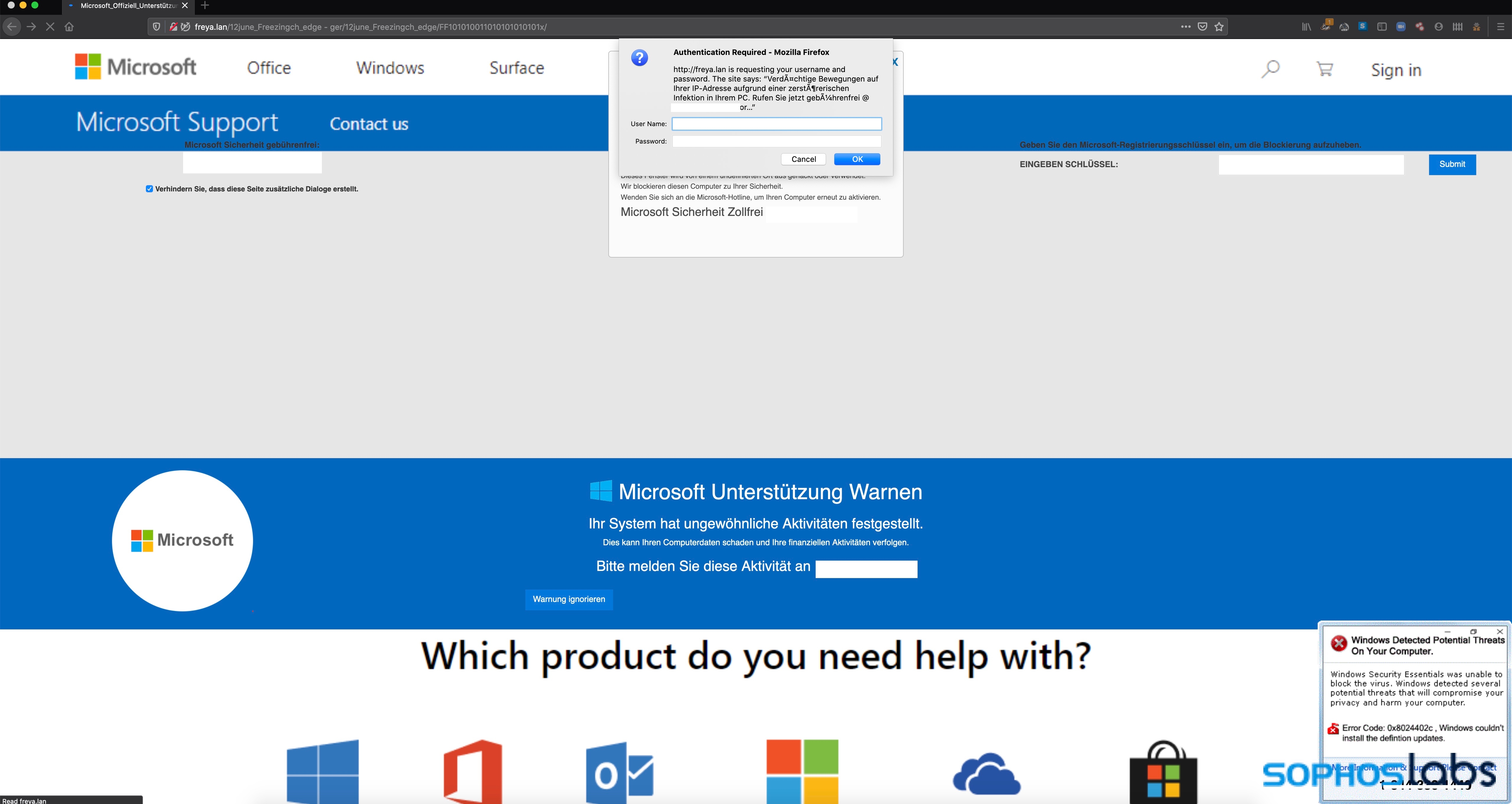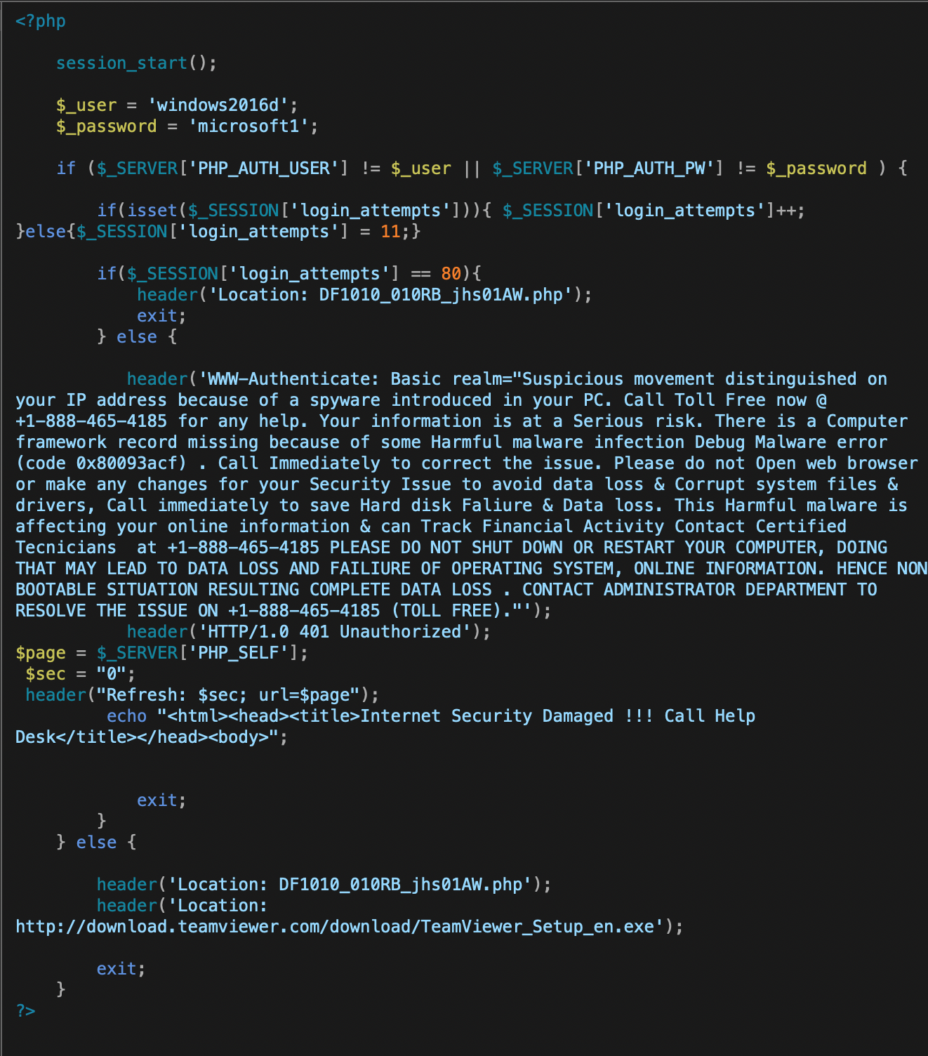 The Firefox and Internet Explorer versions of the attack page are a little heavier on the social engineering, and come with an additional piece of server-side code: a PHP-based dialog box that prompts for a username and password. While this might appear to be an attempt to steal user credentials, it’s not that sophisticated. Instead, the code has a hard-coded username and password that would be provided by the support scammers to initiate the download of TeamViewer, a legitimate remote control software package that is commonly used by tech support scams to take control of victims’ computers with their assistance and to install “fixes.” The text is classic tech support scam gibberish: