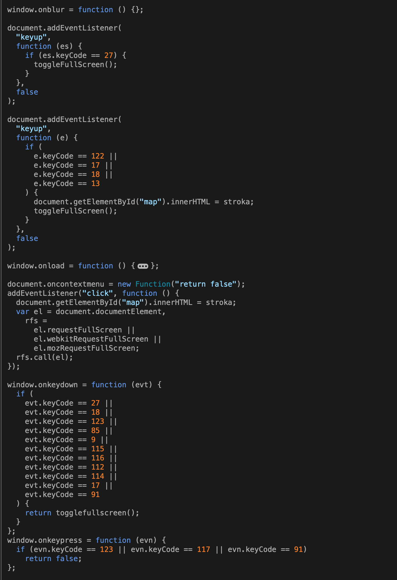The code above also includes a variable named “stroka” that defines a base64-encoded image map to be loaded as part of a full-screen view if there’s a mouseclick anywhere on the browser page. The mouseclick launches the function toggleFullScreen, shown below: