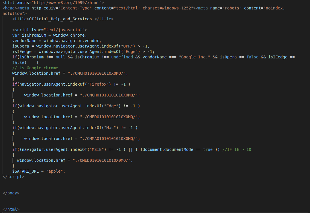 The kit includes an initial PHP landing page that checks the browser type visiting the page, and then redirects to the appropriate subdirectory for tailored attack: