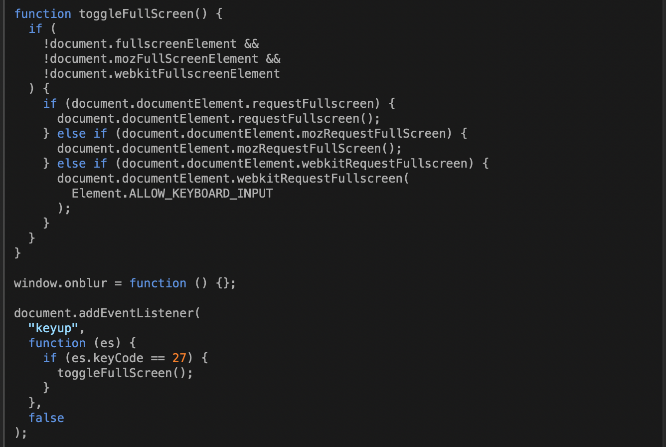 The toggleFullScreen function also captures the escape key to prevent restoring from full screen view.
