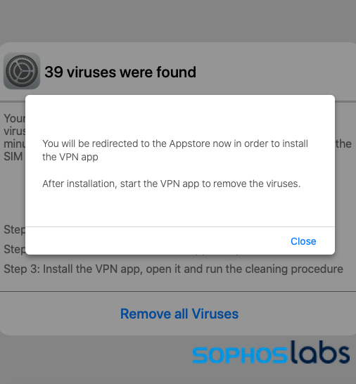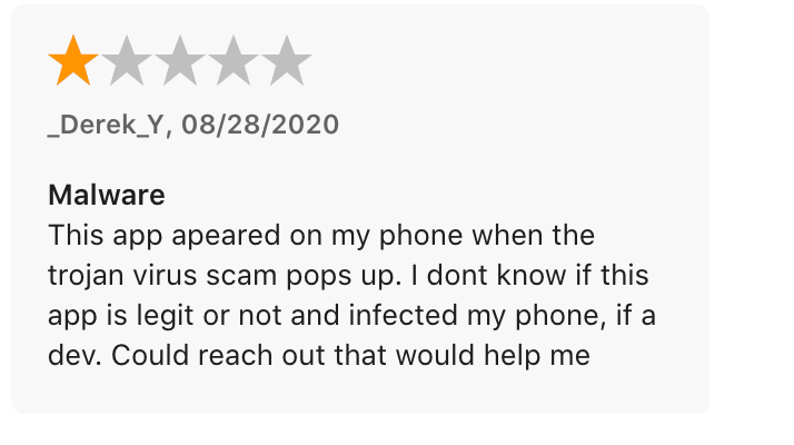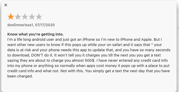 Most of the iOS fake alerts we discovered linked to App Store listings for a group of apps claiming to be virtual private networking and site blocker tools. These apps all included in-app purchases, and required payments after a trial—with one VPN app from a developer in Belarus charging $10 a week for a subscription. Most of the reviews of the apps appeared fake, with some telling one-star reviews: