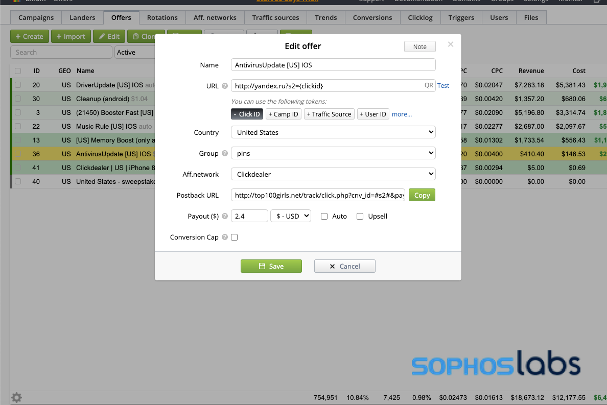 A sample Binom “offer”—here an iOS Antivirus update popup as an example—sets up a “tracker” page, which acts as the relay between the ad network and the target page, the affiliate network the traffic for the popup will be bought from, and the amount offered for the traffic. Here, the “postback”—the URL that is sent as the popup—is on top100girls[.]net.
