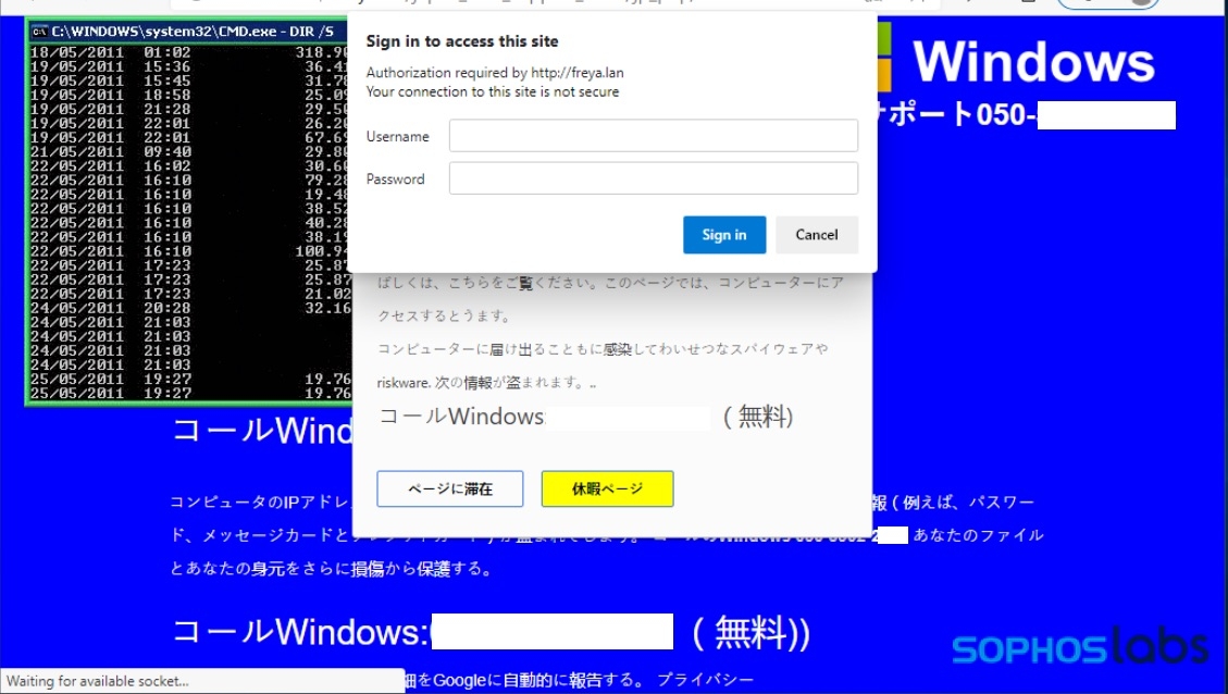 These approaches all funnel to a common workflow: getting the victim on the phone, convincing them that the threat is legitimate, getting them enable remote access, and then cashing in, usually through a combination of selling legitimate or fraudulent malware protection software and other services that often include a persistent backdoor for later activities. In some cases we’ve investigated in the past, the victim’s computer becomes an exit node for a peer-to-peer VPN service, allowing the scammers to use the victim’s Internet connection for further scams.