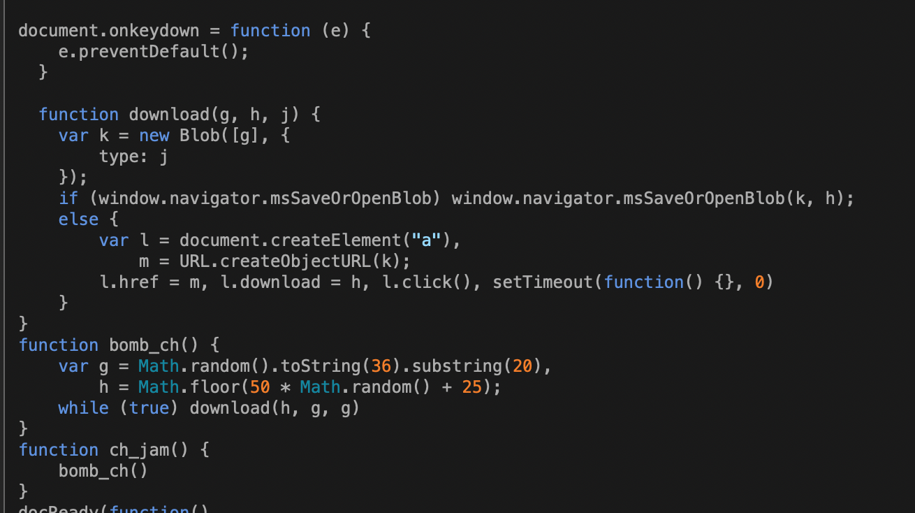 In addition to this login box, the code for the Firefox version uses the same code we found in our research on previous Firefox browser locking bugs, using a combination of “evil cursor,” JavaScript-driven BLOB downloads, and JavaScript math computations designed to slow browser responsiveness.