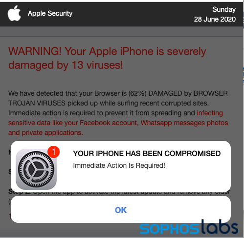 In the course of our research into these “browser lock” attacks, we also encountered a large number of fake alerts targeting mobile devices using the same web advertising networks and traffic routing sites. These scams, which use web pages crafted to resemble mobile operating system alerts, follow the same pattern as desktop scams in that they are either linked to tech support scams or to PUA downloads—including “fleeceware” apps in Google’s and Apple’s app stores. These types of scam pages have been around for several years. But they remain a threat—mostly because of weaknesses in the pop-up defenses of mobile web browsers. And because they don’t carry any obviously malicious code, most don’t trigger any sort of anti-malware detection. They’re a sort of a “scareware” version of malicious advertisements—scarevertising.