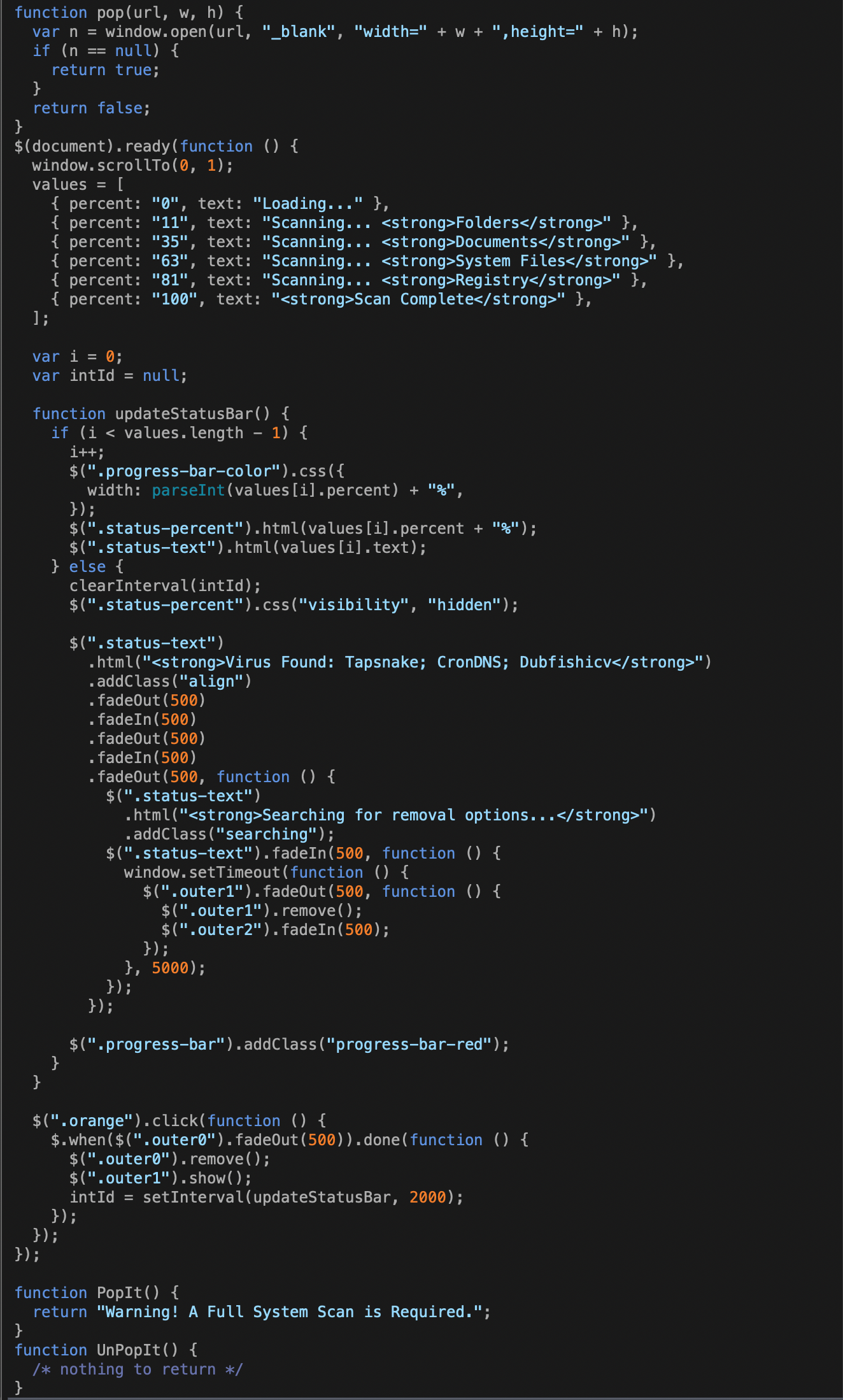 A segment of the JavaScript code in the Chrome-targeted FakeAlert site attempts to spoof a virus scan.