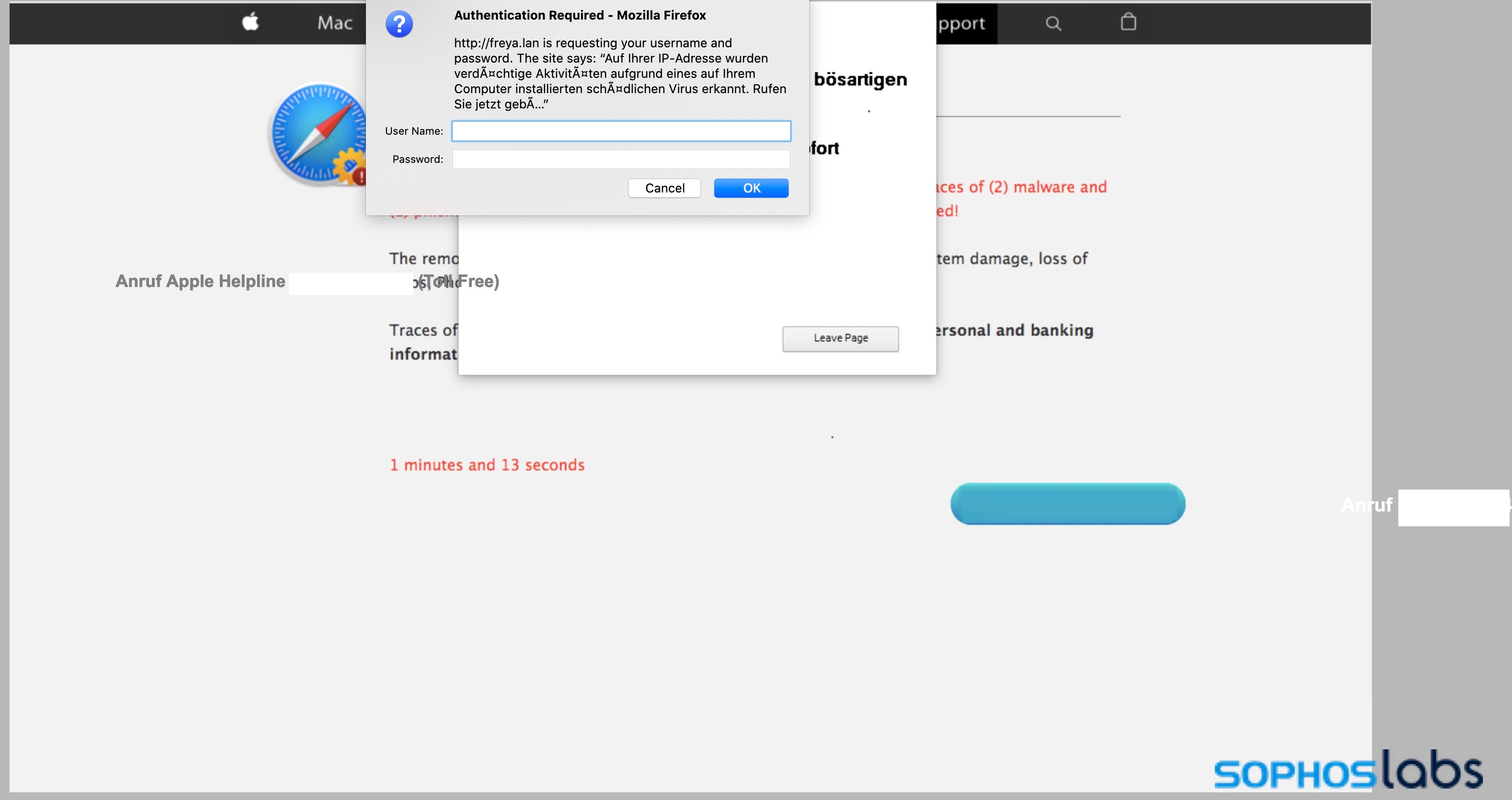 Just as with the other attack pages, the Safari-focused page is replete with misspellings and other telltales that this may not actually be an “Officiall Apple Support”(sic) alert page. The entire body of the page itself is a base64-encoded image. The additional elements of the page are driven by two JavaScript files. The first plays the audio files shared with the other pages in the kit, captures mouse clicks and launches a full-screen popup of the page. The other contains the contents of the dialog box that pops up after the full-screen popup: