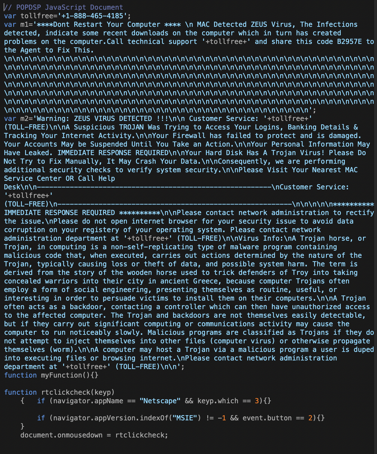 The code behind this site is clearly designed as a kit to be deployed by scammers with relatively little skill. The phone number and alert text used for the scam is set in a JavaScript file, text.js, which can specify different messages based on different referring websites:
