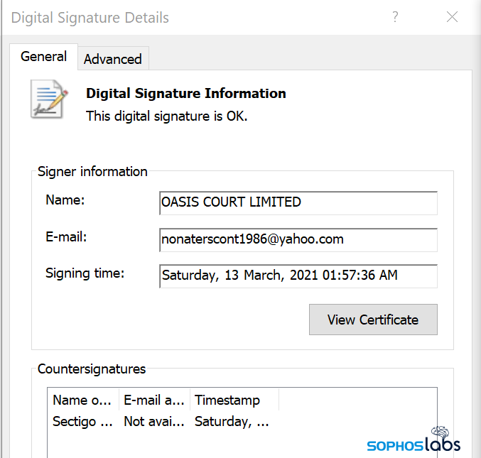 The Cobalt Strike beacon was a DLL that was given a random name, and executed from the C:\Windows\Temp directory by a command issued through the bot.ps1 backdoor. These payloads were all signed by a Sectigo-issued certificate assigned to OASIS COURT LIMITED, with validity that does not expire until the end of 2021, tied to a yahoo.com email address.