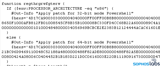 - Module_AMSIBypassMaybe_regthrgrwfgterw.ps1: a dropper that delivers either a 32-bit or 64-bit DLL as a payload, and then patches the payload’s entrycode in an attempt to defeat AMSI-based malware detection.