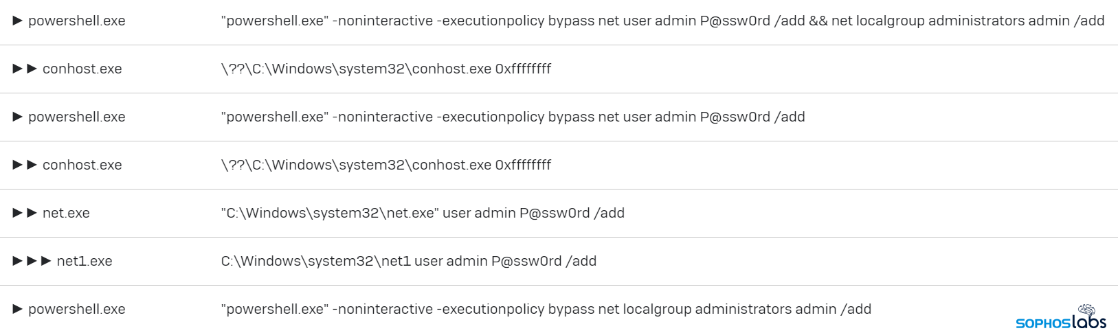 For all the effort involved, the attackers did not employ particularly good security, themselves. They created accounts named admin on several machines (with a password of “P@ssw0rd“) and added them to the Administrators group.