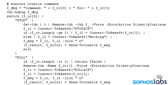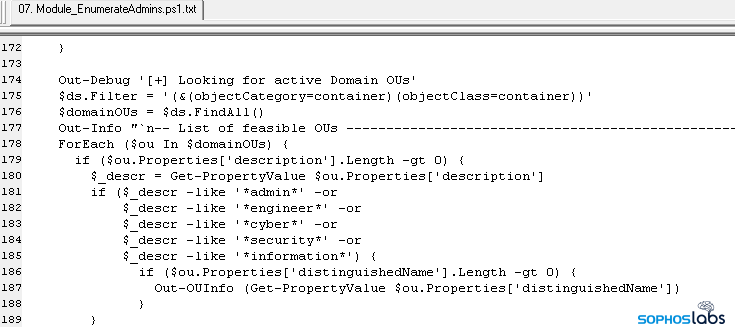In addition to the PowerShell remote access tool, bot.ps1, the threat actors created a series of other PowerShell scripts, which they deployed as modules to enhance the core functionality of bot.ps1. These were run across the target’s network in an attempt to conduct reconnaissance and give themselves the privileges they needed to complete the attack.