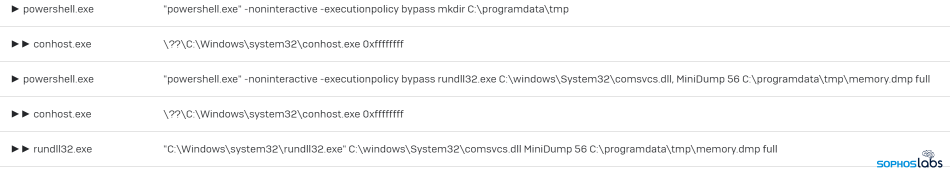 This was clearly an information-gathering and “establishing control over lots of machines” phase of the attack, as the threat actors mapped the network using a tool called ADRecon, and identified additional machines they would later pivot to. They used PowerShell commands to dump memory from LSASS on some of these other internal machines remotely, and then pulled those dump files back to the Exchange sever – their initial foothold – for retrieval and offline extraction of more credentials.